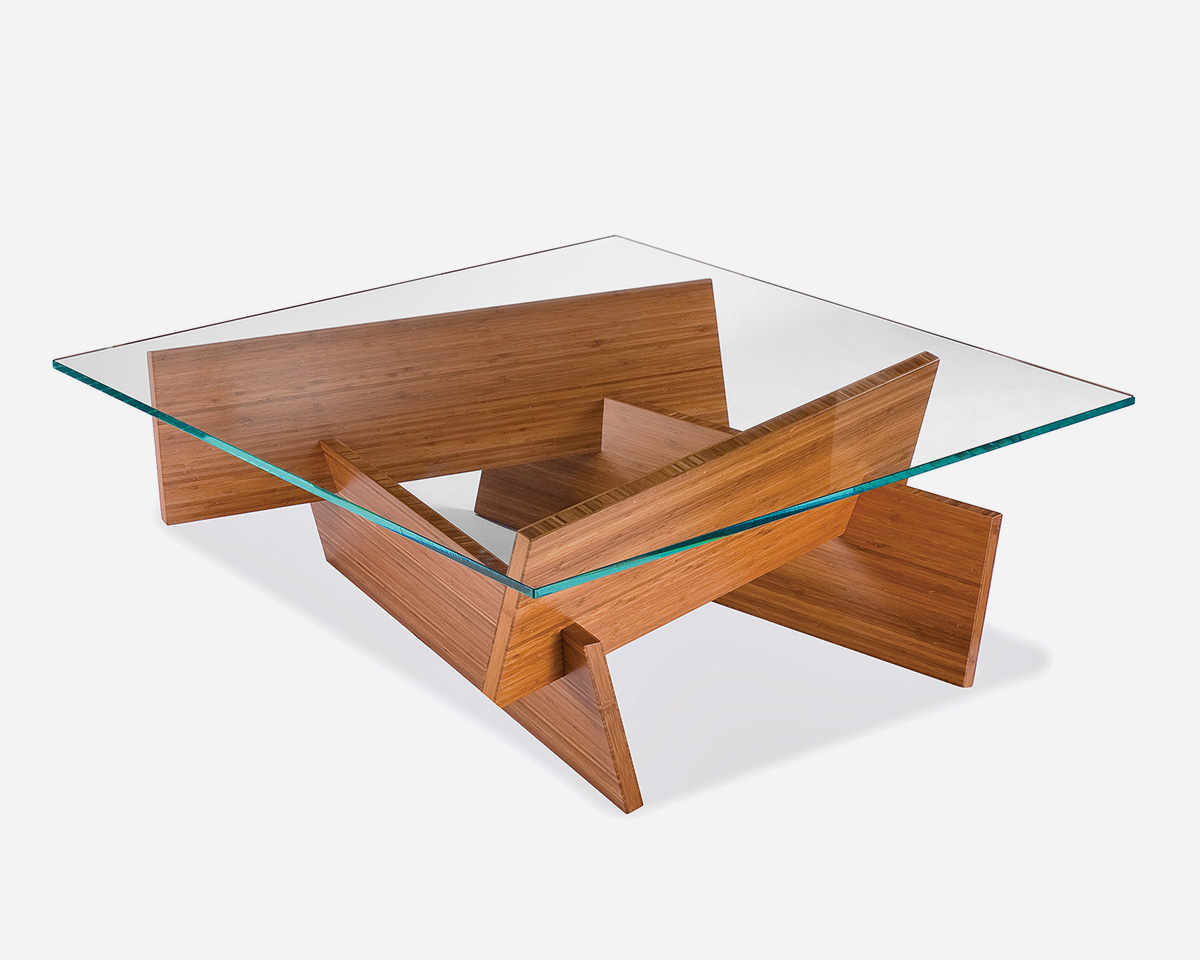 The Sprout table presents a dynamic sculptural expression. Manufactured from bamboo and glass, the elements are carefully balanced and intersected to create a delicate three dimensional composition. In addition to its visual richness, Sprout was designed to be extremely strong, maximize material yield, and have a timeless relevance.